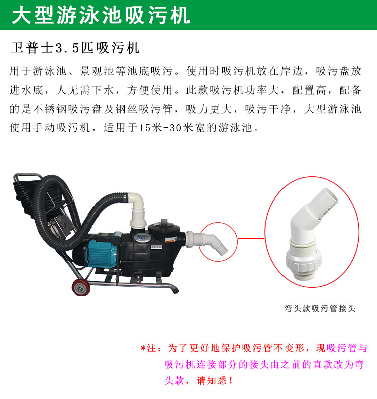 衛(wèi)普士游泳池吸污機手動(組合式,岸基型),功率為3.5匹,是游泳池手動吸污機中功率較大的,也叫大型泳池吸污機或標準池吸污機,景觀池吸污機。