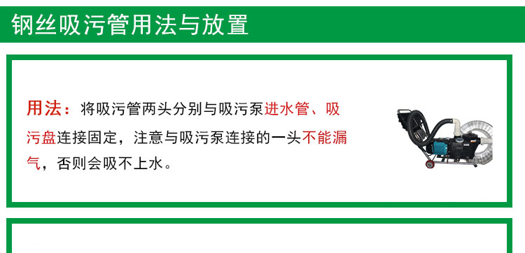 (注:如果池面有樹葉、塑料袋等其他垃圾,請用撈網(wǎng)打撈走,不管是游泳池手動還是自動吸污機都吸不了漂浮于水面的垃圾,另外池壁或池底已長出的青苔不一定能完全吸掉,如遇到此類粘著力較強的污物,需手動使用清潔刷,刷掉,請知悉!)