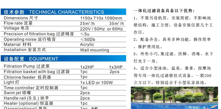 4.適合小型泳池,溫泉,桑拿,按摩池等專用一體化過濾壁掛式設備。一般200立方以下,特別適合于小型私家泳池。