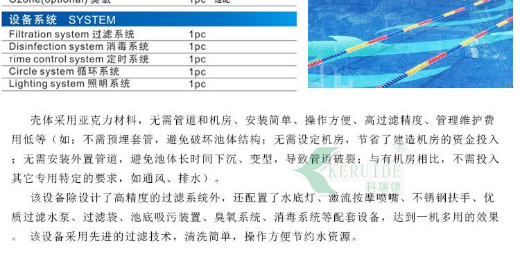 該設備除設計了高精度的過濾系統外,還配置了水底燈、激流按摩噴嘴、不銹鋼扶手、高低速過濾水泵、過濾袋、池底吸污裝置、臭氧系統、消毒系統等配套設備,達到一機多用的效果。該設備采用先進的過濾技術,高過濾精度,清洗簡單,操作方便節約水資源。