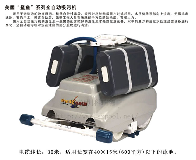 美國進口鯊魚系列王子型全自動吸污機,又叫“帝鯊”王子型商用吸污機,配30米線。主要用于室內泳池或私家泳池的池底吸污。適用于標準吸污機。