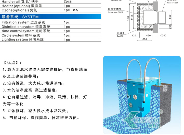 【應用范圍】:適合小型泳池,溫泉,桑拿,按摩池等專用一體化過濾壁掛式設備。一般200立方以下,特別適合于小型私家泳池。???
