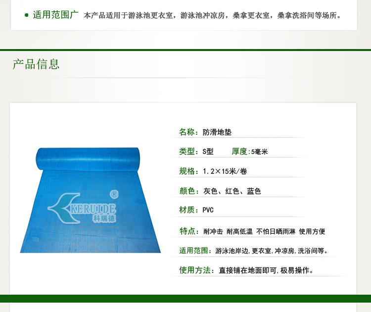 4,適用范圍廣:本產品適用于游泳池岸邊,更衣室,沖涼房,洗浴間等場所。