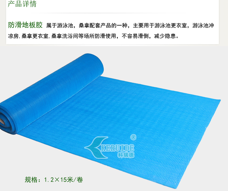 PVC防滑地墊,屬于游泳池,桑拿配套產品的一種,主要用于游泳池岸邊,更衣室,沖涼房,更衣室,洗浴間等場所的防滑,使人在這些場所不容易滑倒,安全。