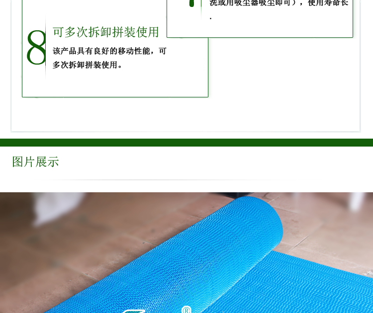 1,方便性:安裝方便,直接鋪在地面即可,極易操作;