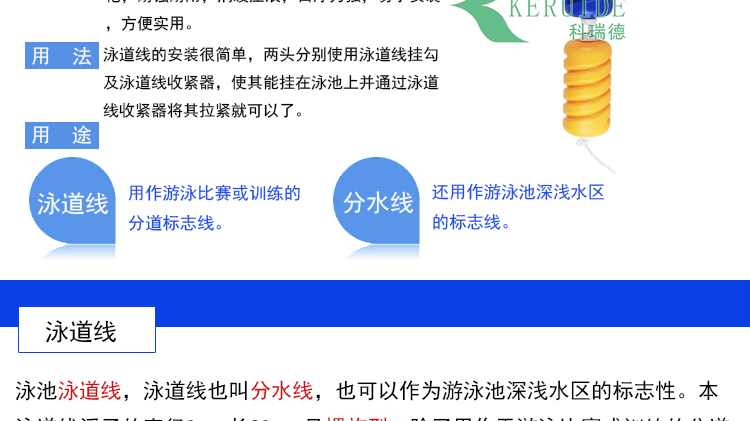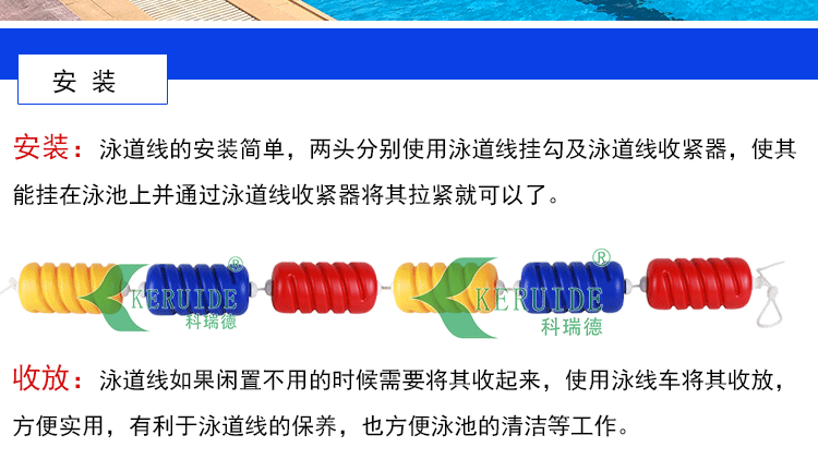 安裝方法:泳道線的安裝簡單,兩頭分別使用泳道線掛勾及泳道線收緊器,使其能掛在泳池上并通過泳道線收緊器將其拉緊就可以了。泳道線如果閑置不用的時候需要將其收起來,使用泳線車將其收放,方便實用,有利于泳道線的保養,也方便泳池的清潔等工作。