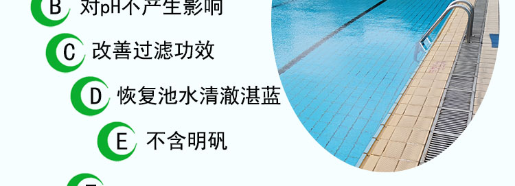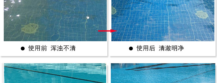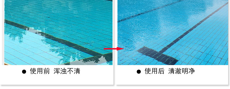 注意:使用此澄清劑,同時需要打開循環過濾系統,這樣才能達到效果。如果沒有循環設備的泳池,則建議不使用此款澄清劑。可用固體的沉淀劑。