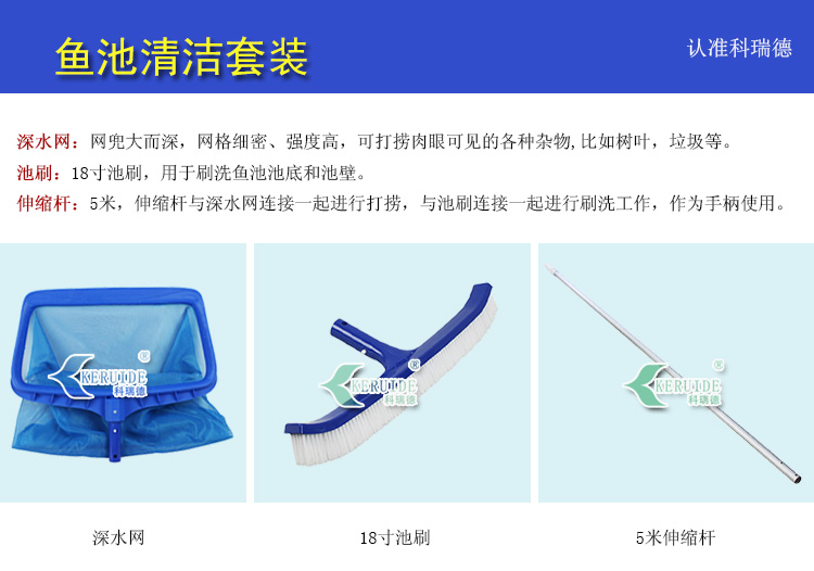 魚池清潔套裝,是一組魚池清潔工具。一共有三種,分別是魚池深水網,18寸池刷,5米伸縮桿。三者互相配合,將魚池清理干凈。