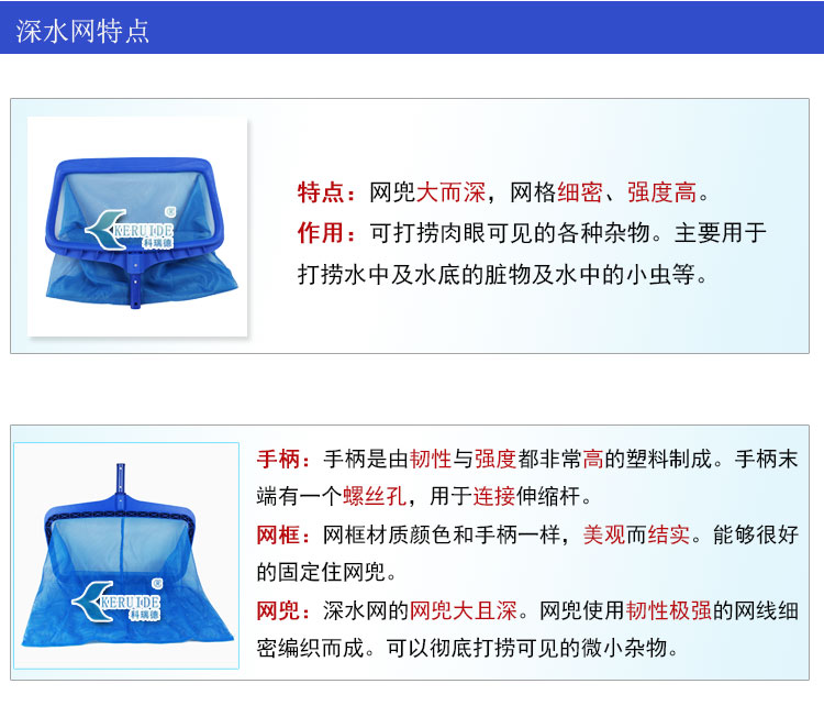 【特點】:魚池深水網的網兜大而深,網格細密、強度高,可打撈肉眼可見的各種雜物。主要用于打撈水中及水底的臟物及水中的小蟲等。