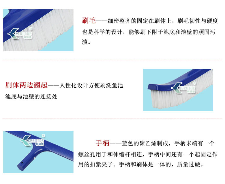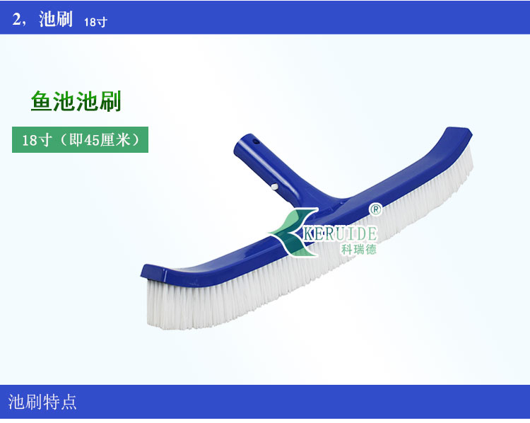 【特點】:刷毛非常細密整齊,高強度高韌性,能夠刷下附于池底和池壁的頑固污漬。該池刷除污效果好,適用于魚池、泳池等。使用方便、簡單,質量有保證。