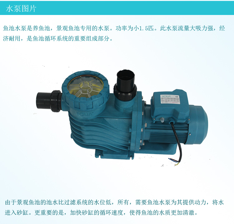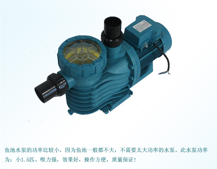 魚(yú)池水泵的功率比較小,因?yàn)轸~(yú)池一般都不大,不需要太大功率的水泵。除了小1.5匹之外,還有1.0匹和小2.0匹水泵可以(根據(jù)魚(yú)池大小)選擇。此水泵效果好,操作方便,質(zhì)量好,免費(fèi)保修一年。
