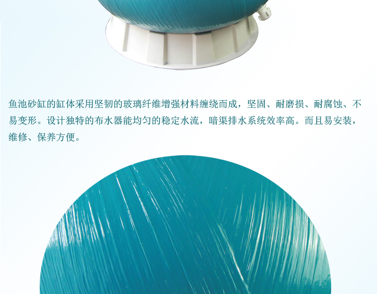 砂缸缸體采用堅(jiān)韌的玻璃纖維增強(qiáng)材料纏繞而成,堅(jiān)固、耐磨損、耐腐蝕、不易變形。設(shè)計(jì)獨(dú)特的布水器能均勻的穩(wěn)定水流,暗渠排水系統(tǒng)效率高。而且易安裝,維修、保養(yǎng)方便。