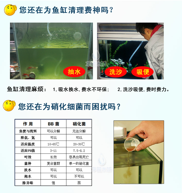 最初放入魚缸時可能有白色或淺黃色渾濁現象。這是BB菌在繁殖的表現,BB菌從繁殖到水質穩定需要數周的時間。