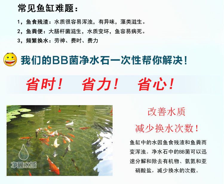 3)本產品為微生物凈水石,從最初投入到形成良好穩定的水質,根據魚的數量和養魚的環境,需要2-3周的適應期。