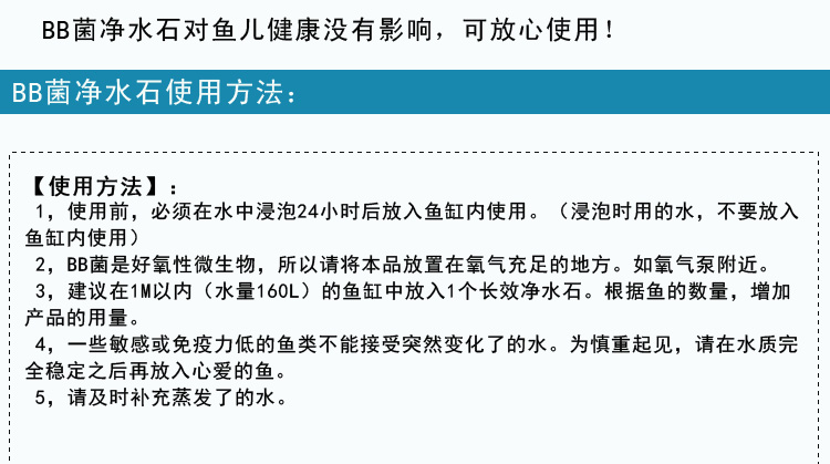 【溫馨提示】:BB菌凈水石安全環保,長效免維護。使用前要先浸泡24小時,再放入魚缸中。微生物產品見效比化學藥劑要慢一些,短至一周,長至數周。性急的魚友慎拍!如果魚缸密度大,又不使用過濾器的,請慎用! 由于養魚習慣及養魚的環境不同,所達到的效果不同,使用時間長短不同。請保持良好的養魚環境。