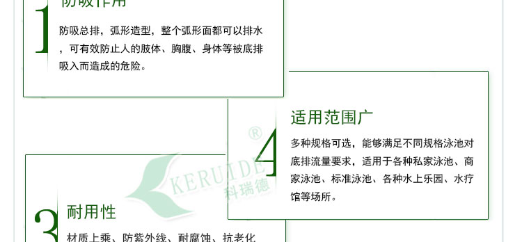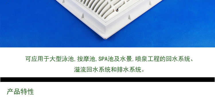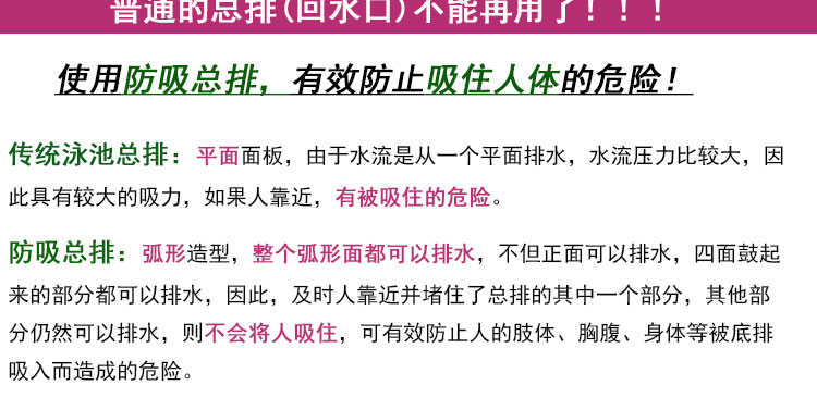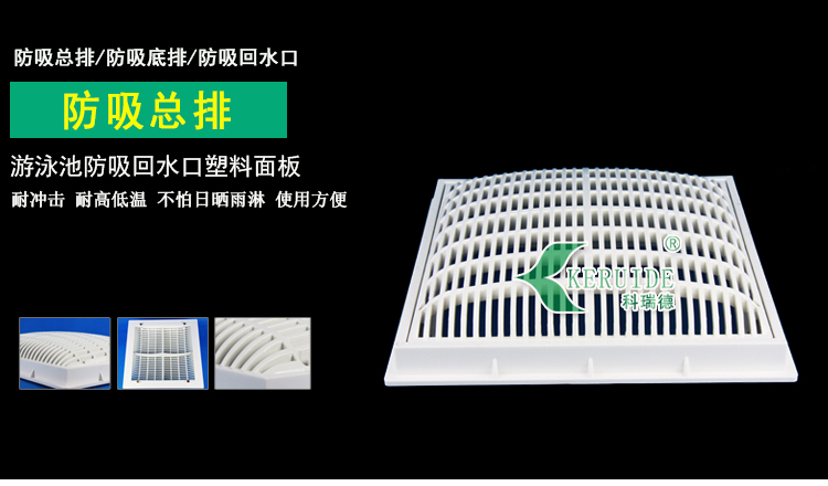 防吸排水口,是可以防吸。也叫做游泳池防吸入底排口,防吸回水口,防吸總排,泳池排水口,防吸泳池底排。如果人體落入底排上,四周還可以流水,人則有效避免不會被吸入的隱患。