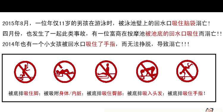 吸卡肢體的危險:因手指等肢體被底排吸卡,并導(dǎo)致無法拔出。