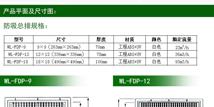 WL-FDP-9? 尺寸;9×9(263mm×263mm)?? 厚度:70mm?? 材質(zhì):工程ABS+UV? 顏色:白色? 額定流量:23m3/h