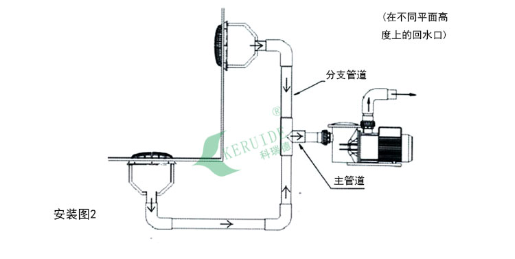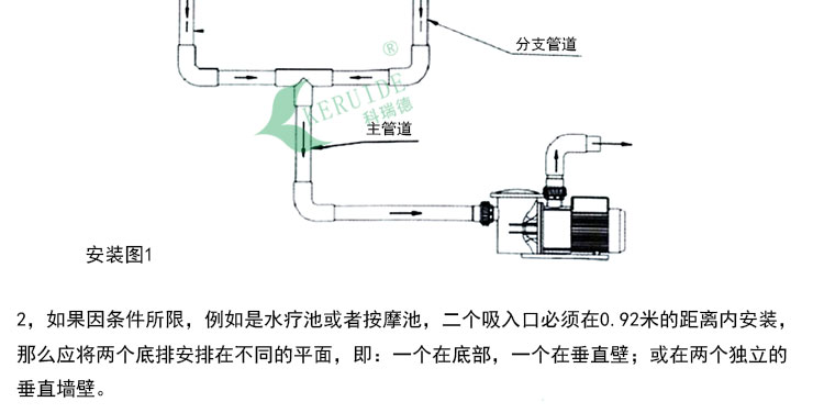 2,如果因條件所限,例如是水療池或者按摩池,二個吸入口必須在0.92米的距離內(nèi)安裝,那么應(yīng)將兩個底排安排在不同的平面,即:一個在底部,一個在垂直壁;或在兩個獨(dú)立的垂直墻壁。