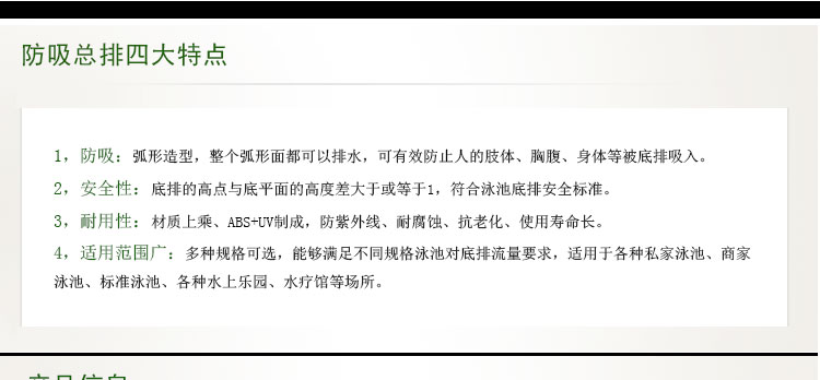 4、多種規(guī)格可選,能夠滿足不同規(guī)格泳池對底排流量要求,適用于各種私家泳池、商家泳池、標(biāo)準(zhǔn)泳池、各種水上樂園、水療館等場所。