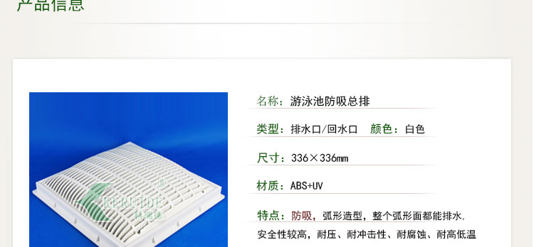 游泳池防吸回水口是為了泳池防吸,減少游泳隱患專門設(shè)計的游泳池防吸排水口,防吸總排,防吸入底排。防吸回水口表面為弧形設(shè)計,如果人體落入底排上,四周還可以流水,防止人被吸入的作用。