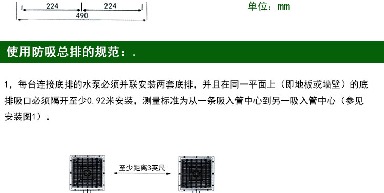 1,每臺連接底排的水泵必須并聯(lián)安裝兩套底排,并且在同一平面上(即地板或墻壁)的底排吸口必須隔開至少0.92米安裝,測量標(biāo)準(zhǔn)為從一條吸入管中心到另一吸入管中心。