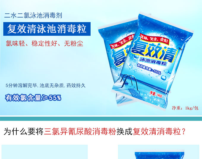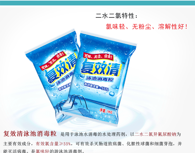 復(fù)效清泳池消毒粒是一種較為安全的游泳池消毒劑,屬于普通化學(xué)品,避免了在運(yùn)輸、儲(chǔ)存及使用過(guò)程中的種種安全隱患!是三氯等危化類(lèi)消毒劑的理想替代品!