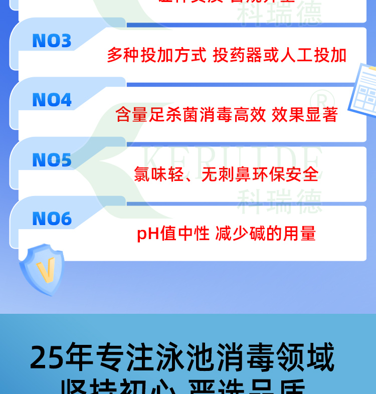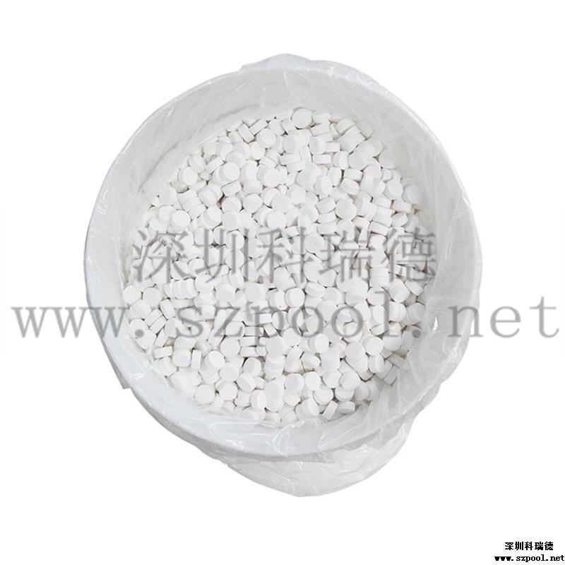 二水二氯帶有2個結晶水,與傳統的二氯異氰尿酸鈉相比,產品氯氣味輕(有效氯不易揮發),這表明產品的化學性質穩定;復效清泳池消毒片就是以二水二氯顆粒為主要成分制作的消毒片,具有以上二水二氯的各項優點,氯味輕、無粉塵,產品pH偏中性,用于游泳池不會對泳池水的pH值造成不良影響,而且藥劑揮發穩定,用于科瑞德泳池自動投藥器進行自動投加。