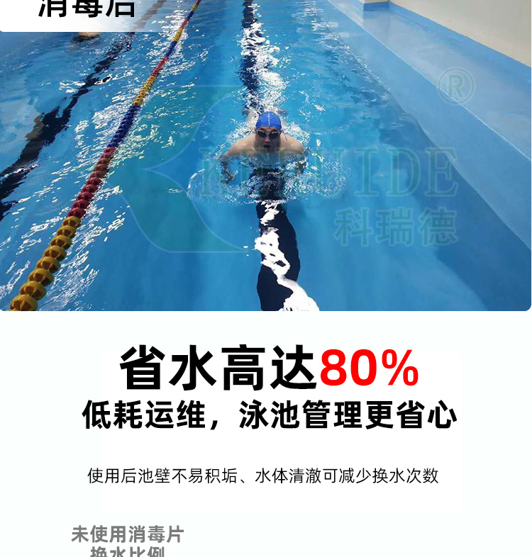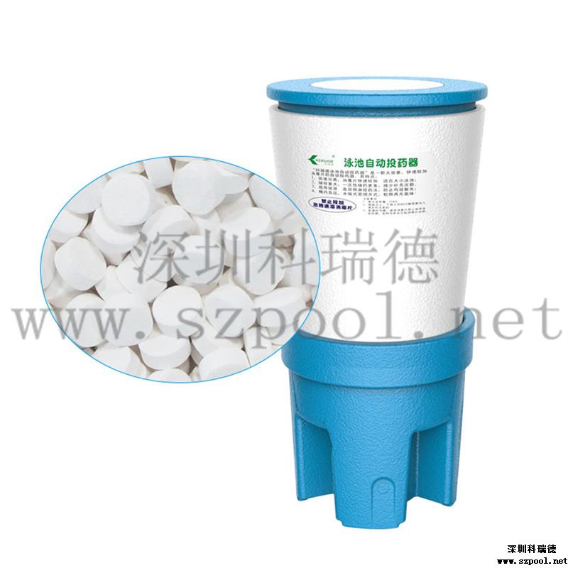 3、將復效凈泳池消毒片加入科瑞德泳池自動投藥器進行自動投加,其加入量由監測儀進行控制,這是一種智能的自動加藥模式,能夠節省人工、物力及藥劑等,并且密封性好,避免了氯氣泄漏造成的腐蝕機房設備及對人體健康造成不良后果,不管是從精力、健康、成本、水質智能化維護角度甚至是衛生監督局抽查角度看,這都是一種較好的自動加藥模式。