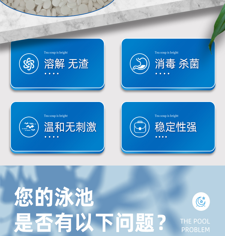 游泳池消毒片有很多種,其中復效清泳池消毒片是以二水二氯異氰尿酸鈉為主要有效成分的游泳池消毒片,屬于游泳池水處理藥劑的一種,有效氯含量≥55%,針對池水殺菌消毒使用,防止水體變壞!