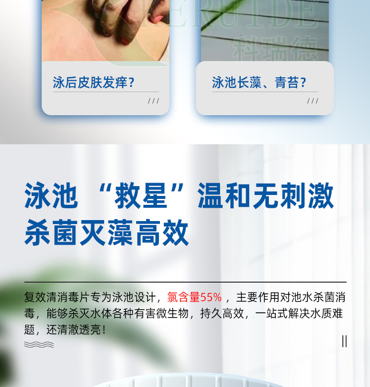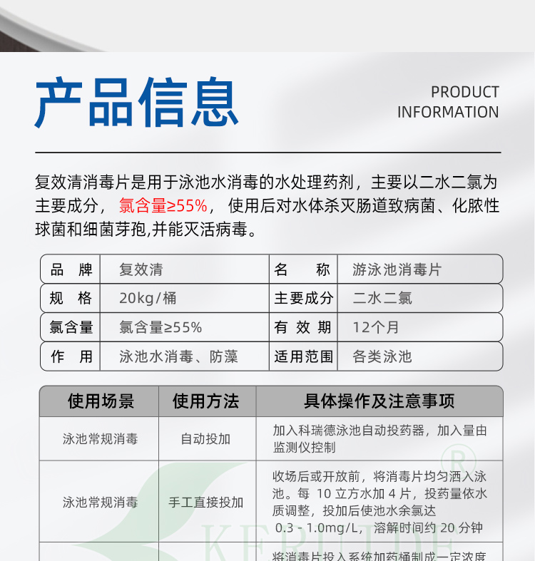 使用范圍:復效清泳池消毒片適用于各類游泳池、水上樂園、水療池、桑拿池、溫泉及景觀池等場所的水體消毒、滅藻,能有效防止游泳池水質發渾、變綠等水質問題。也可以用于以上各類場所的更衣室、洗手間等的消毒除臭。