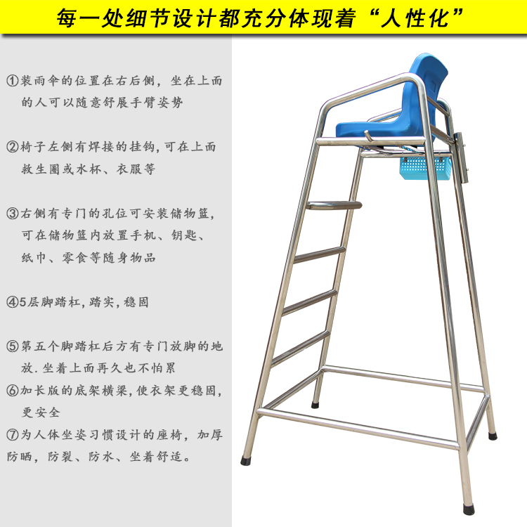 游泳池救生椅是救生員從高處觀察泳區情況的專用座椅,當泳池內有人發生意外時,救生員能夠從救生椅處第一時間發現情況,并且迅速地采取救治措施,可以說救生椅是泳池及海濱廣場等游樂場所的安全輔助措施,屬于游泳池救生設備的一種。