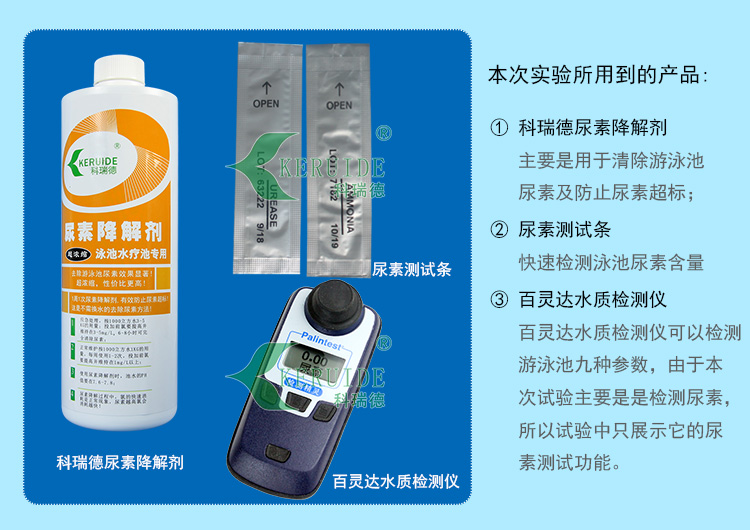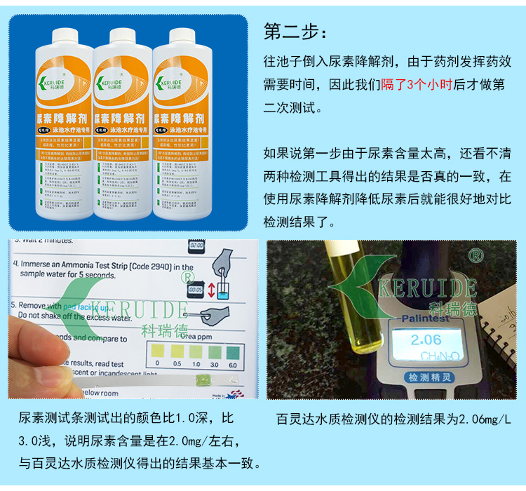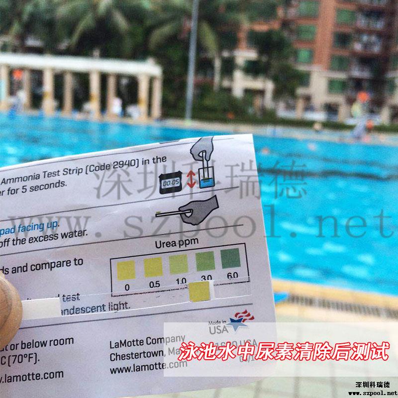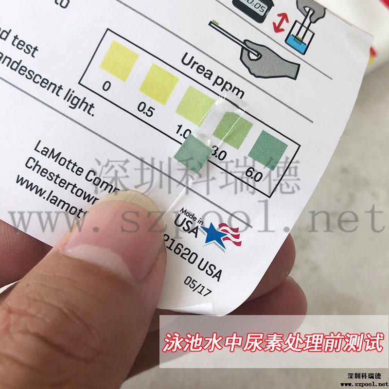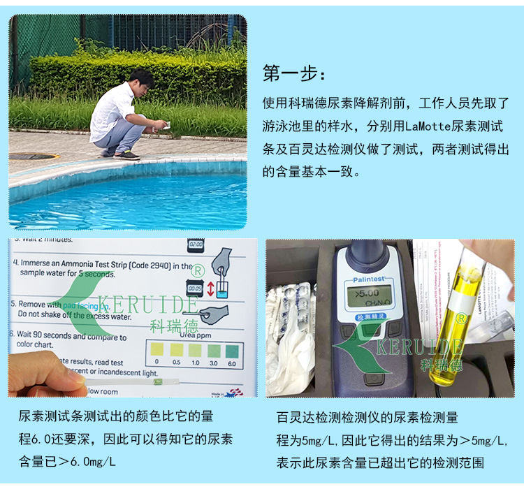 使用科瑞德尿素降解劑前,工作人員先取了游泳池里的樣水,分別用LaMotte尿素測(cè)試條及百靈達(dá)水質(zhì)檢測(cè)儀做了測(cè)試,兩者測(cè)試得出的含量基本一致。尿素測(cè)試條測(cè)試出的顏色比它的量程6.0還要深,因此可以得知它的尿素含量已>6.0mg/L;因?yàn)榘凫`達(dá)檢測(cè)儀的尿素檢測(cè)量程為5mg/L,因此它得出的結(jié)果為>5mg/L,表示此尿素含量超出它的檢測(cè)范圍;