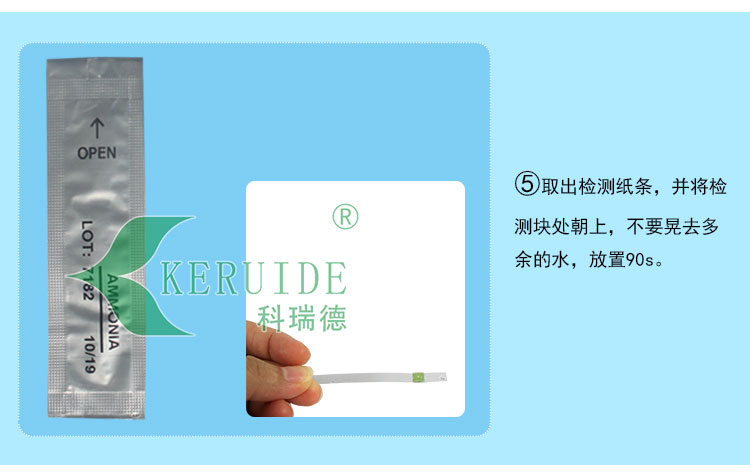 4. 取出一根尿素氨檢測(cè)紙條(Ammonia Test Strip for UREA),把貼有黃色檢測(cè)試劑的一頭放進(jìn)樣水中約5s;
