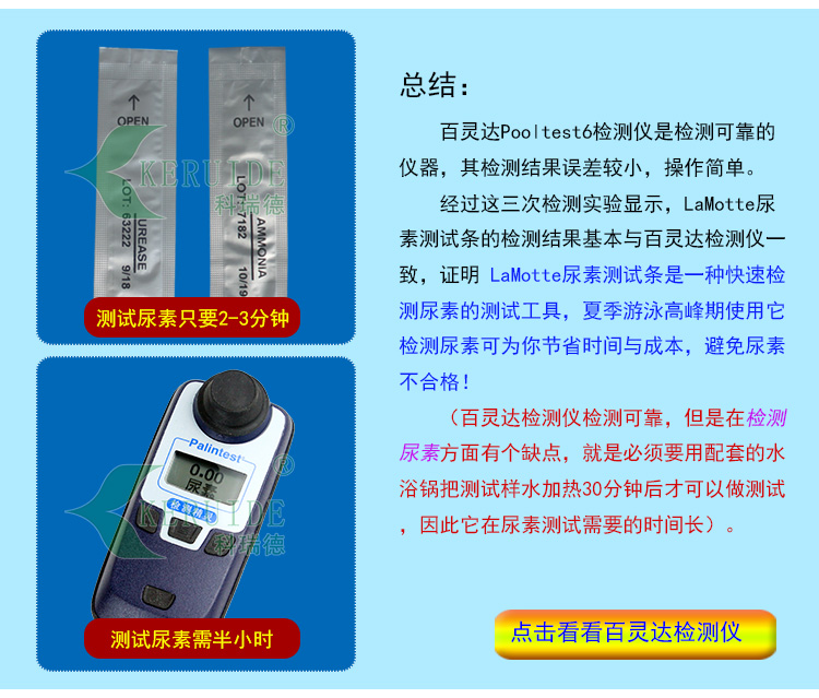 經(jīng)過這三次檢測(cè)實(shí)驗(yàn)顯示,LaMotte尿素測(cè)試條的檢測(cè)結(jié)果基本與百靈達(dá)檢測(cè)儀一致,證明 LaMotte尿素測(cè)試條是一種檢測(cè)尿素快速、方便且可靠的產(chǎn)品,適合夏季游泳高峰期使用它檢測(cè)尿素可為你節(jié)省時(shí)間與成本,防止尿素不合格!
