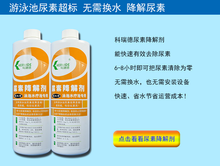 快速去除尿素的方法有兩種:一種是給游泳池注入新水,稀釋水中的尿素含量;一種是使用科瑞德游泳池尿素降解劑進(jìn)行處理,這是無需換水的去除尿素方法,而且可以把尿素含量降到為0。但是不管使用那種方法,都需要時(shí)間,因此我們建議大家在閉館后再進(jìn)行尿素檢測(cè),如果尿素超標(biāo)了則可以有充分的時(shí)間去進(jìn)行水處理,這樣不影響第二天游泳池的開放。