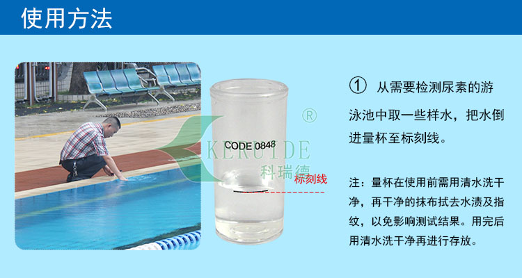 1. 用杯子取一些游泳池樣水,把樣水倒進(jìn)配套的量杯中至標(biāo)刻線即可(量杯在使用前請(qǐng)先用清水洗干凈,并用干凈的抹布拭去水漬,杯內(nèi)不要留下指紋,以免影響測(cè)試結(jié)果);