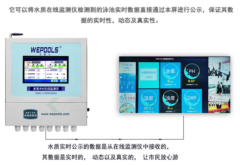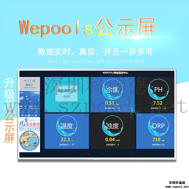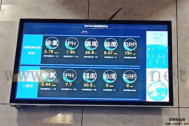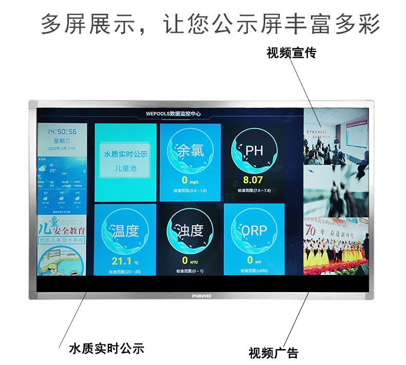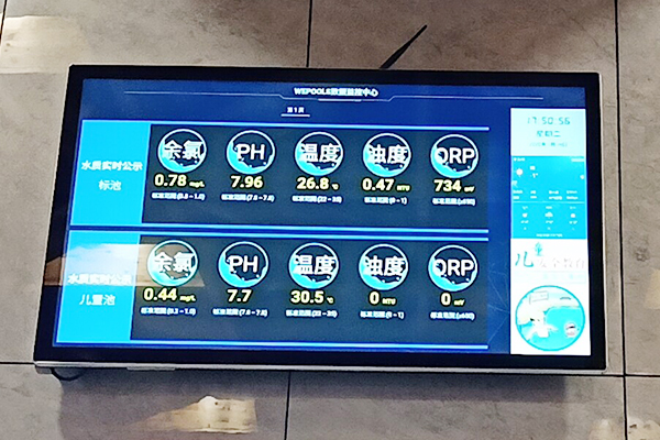 衛普士水質實時公示屏的設計理念是為解決目前泳池手寫水質數據公示的落后方式而研發的。其水質數據是通過在線監測儀監測到的水質情況傳送過來公示的,數據是實時、動態以及真實的。并且衛普士實時公示屏還可以分屏設置,給公眾展示游泳場館的各類設施及宣傳,達到一屏多用的效果。