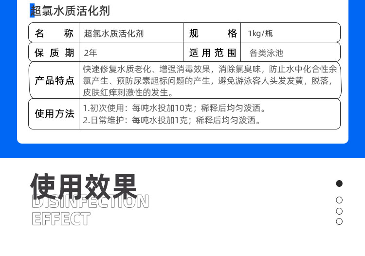 使用方法:1.初次使用,每噸水投加10克,稀釋后均勻潑灑。