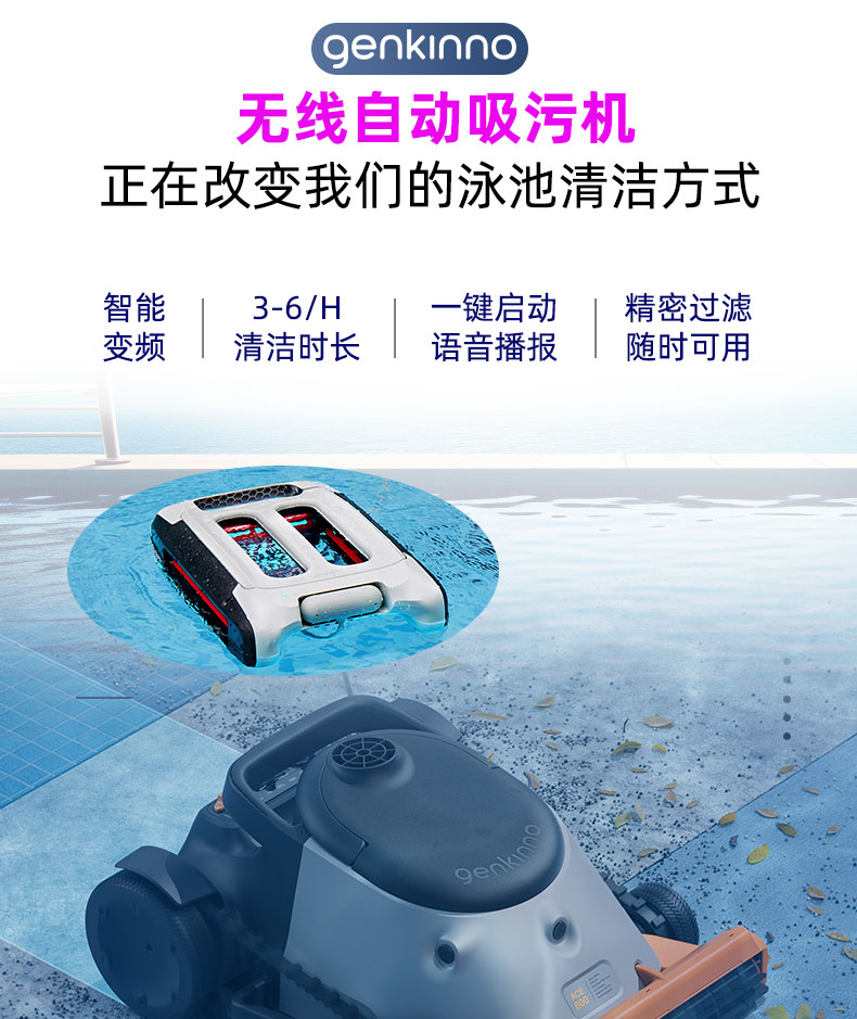 智能規劃清潔路徑,無需人工干預,可以有序的在泳池清潔,無線設計,大大提高清潔效率,