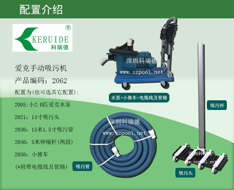 本泳池吸污機為組合式,岸基式吸污機,也叫愛克泳池吸污機,主要配件為小2.0匹的愛克水泵,配件可以根據自己的泳池的情況選擇。AQUA“愛克”泳池設備源自意大利,具有多年的生產歷史。“愛克”泳池設備行業占據重要的地位,很多游泳池管理員選擇手動吸污機時均選擇愛克吸污機。質量好,使用安全。特別適合泳池、別墅泳池、SPA水療池水底吸污使用。