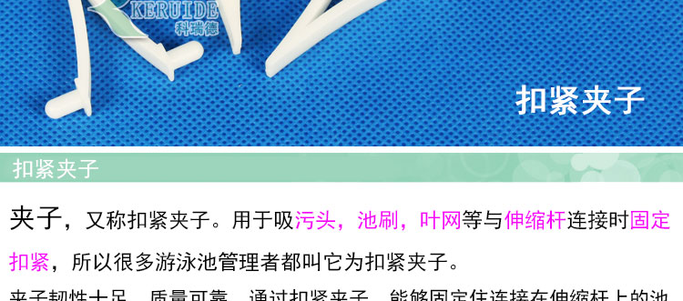 扣緊夾子在日常生活中也經常見到,日常生活中用到的扣緊夾子太單薄,本款夾子韌性好,通過扣緊夾子,能夠固定住連接在伸縮桿上的池刷或者吸污頭。并且,卸下來也方便。