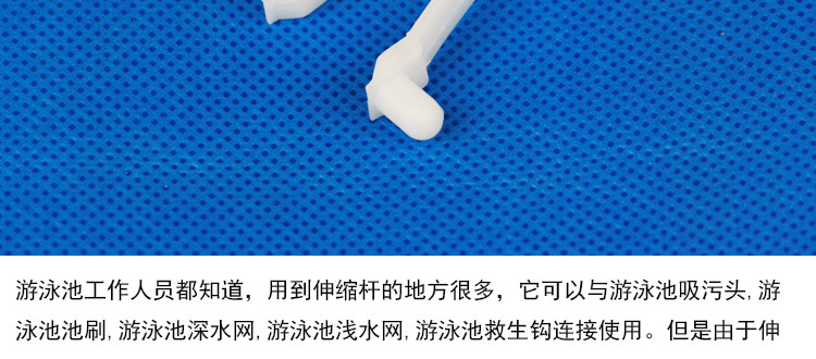 游泳池工作人員都知道,用到伸縮桿的地方很多,它可以與游泳池吸污頭,游泳池池刷,游泳池深水網,游泳池淺水網,游泳池救生鉤連接使用。但是由于伸縮桿自身的特點(圓柱形,相對較光滑),與其連接的泳池用品穩定程度都不能夠達到要求。而且,無論是葉網,還是池刷,還是吸污頭這些泳池用品工作的時候都是活動比較大的,如果沒有扣緊夾子,在工作過程中很容易松動或者滑脫,影響吸污和刷洗工作。