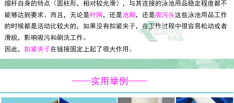 扣緊夾子的用處非常多,只要用到伸縮桿的地方都有它的身影,所以,建議泳池工作者多買點以備用。