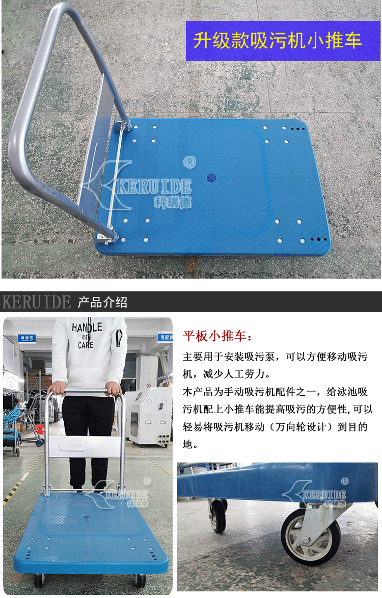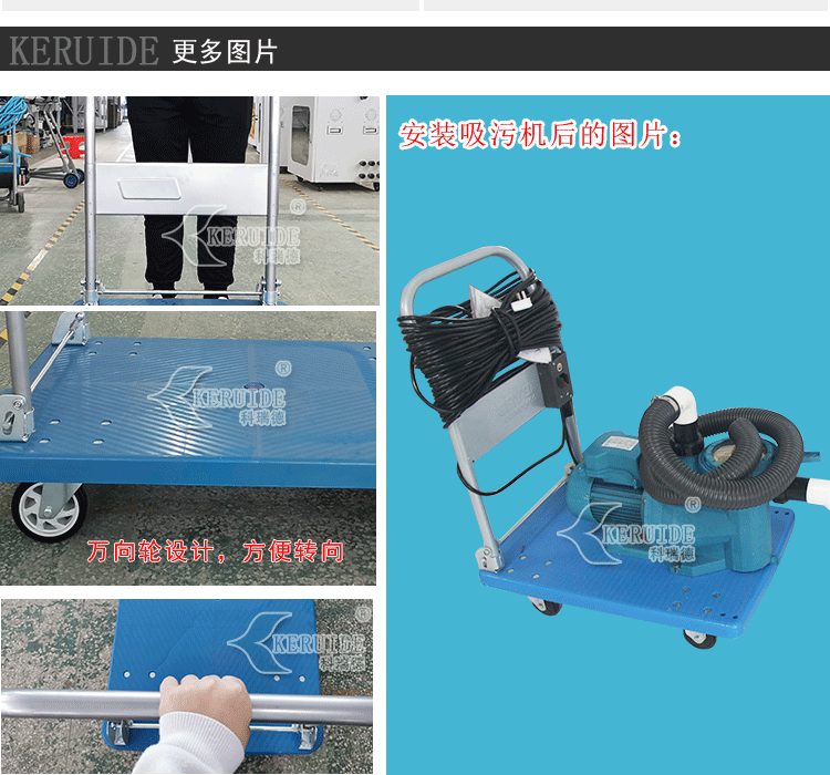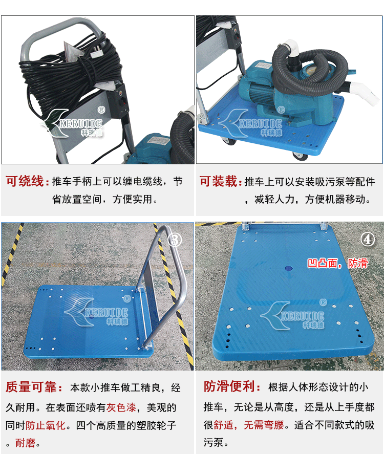 3,便利性:根據(jù)人體形態(tài)設(shè)計(jì)的小推車(chē),無(wú)論是從高度,還是從上手度都非常契合。適合不同款式的吸污泵。