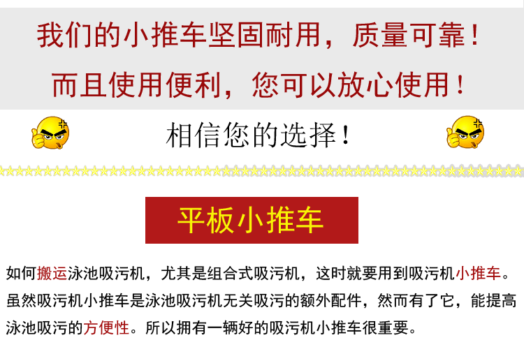 泳池吸污機(jī),尤其是組合式吸污機(jī)的使用搬運(yùn)的方便性,取決于吸污機(jī)小推車(chē)。雖然吸污機(jī)小推車(chē)是泳池吸污機(jī)無(wú)關(guān)乎吸污的額外配件,然而有了它,泳池吸污的方便性將大大的提高,就不用工人辛辛苦苦的搬來(lái)搬去,還能加快速度,省時(shí)省力,提高工作效率,所以擁有一輛好的吸污機(jī)小推車(chē)非常重要。