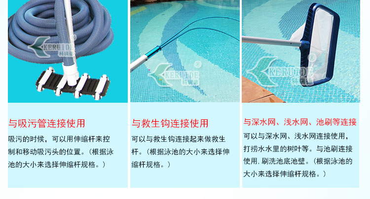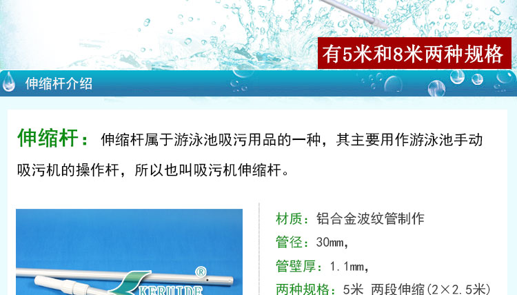 規(guī)格為5米,兩段伸縮(2*2.5米).可以與游泳池吸污頭,游泳池池刷,游泳池深水網(wǎng),游泳池淺水網(wǎng),游泳池救生鉤連接使用。