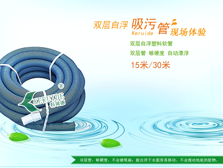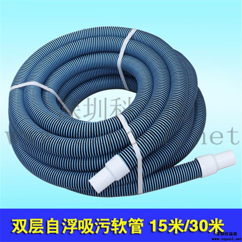 游泳池吸污管:是游泳池吸污機(jī)的配件,用于連接水泵和吸污頭,本吸污管為雙層自浮塑料軟管,也叫游泳池吸污喉。