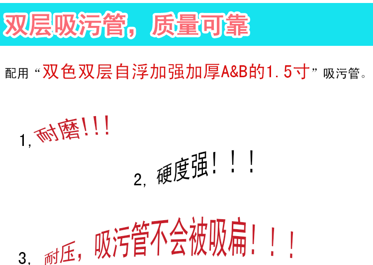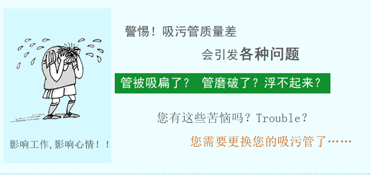 本游泳池吸污管是雙層管,夠硬度,不會(huì)被吸扁,耐壓耐用;能自浮于水面容易移動(dòng),并且不會(huì)攪動(dòng)池底的臟物而影響吸污效果,是塑料吸污管中質(zhì)量好的。