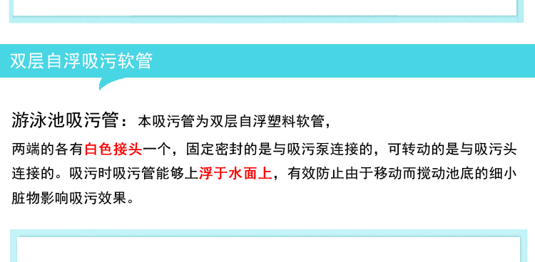 吸污管的兩端的各有白色接頭一個(gè),固定密封的是與吸污泵連接的,可轉(zhuǎn)動(dòng)的是與吸污頭連接的。吸污時(shí)吸污管能夠上浮于水面上,有效防止由于移動(dòng)而攪動(dòng)池底的細(xì)小臟物影響吸污效果。